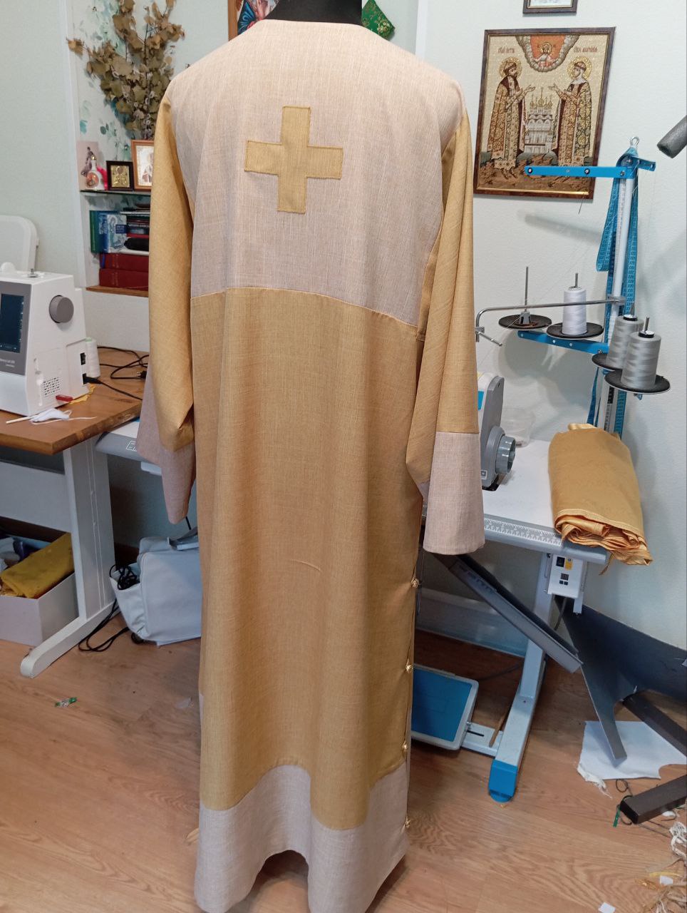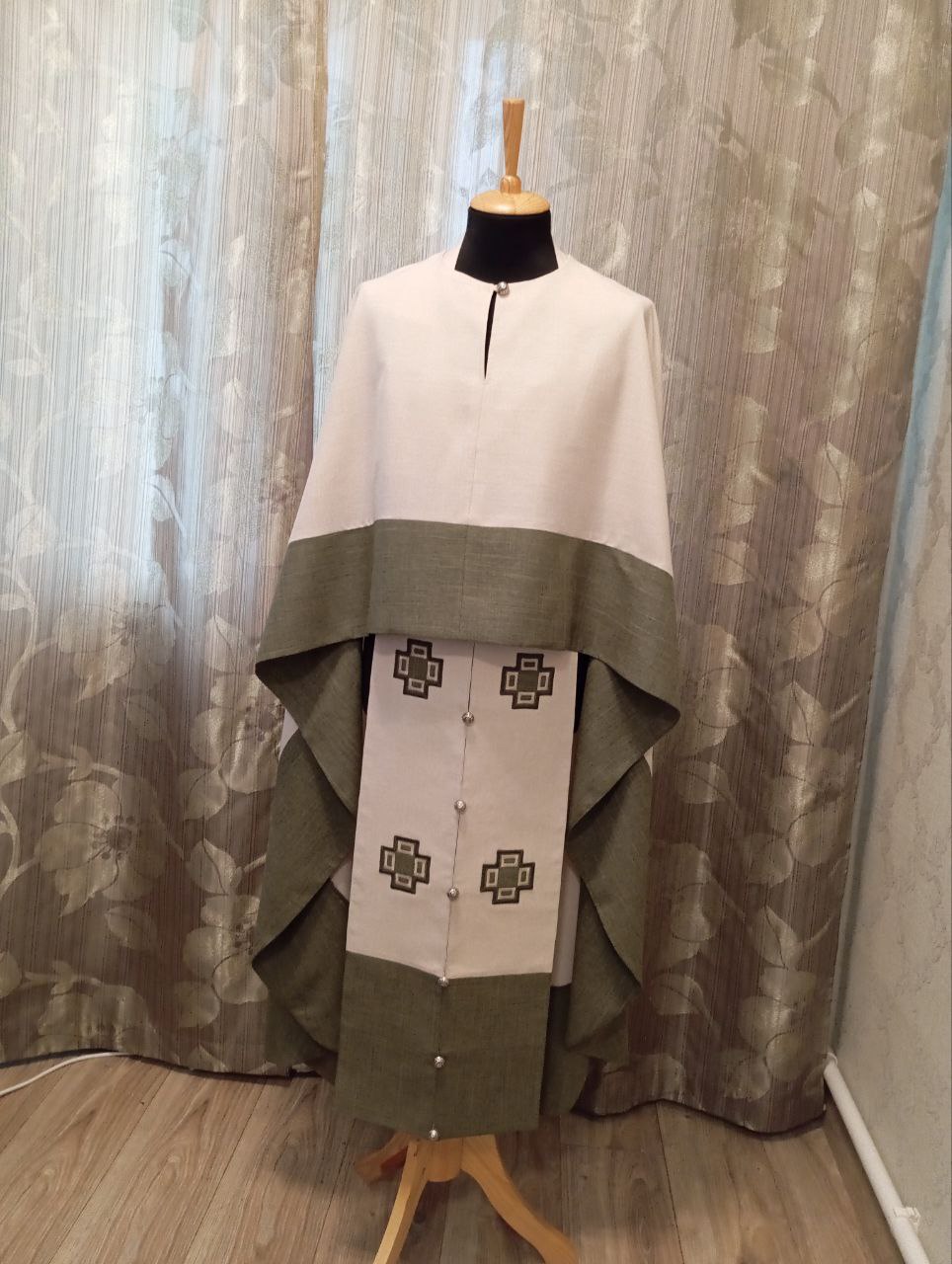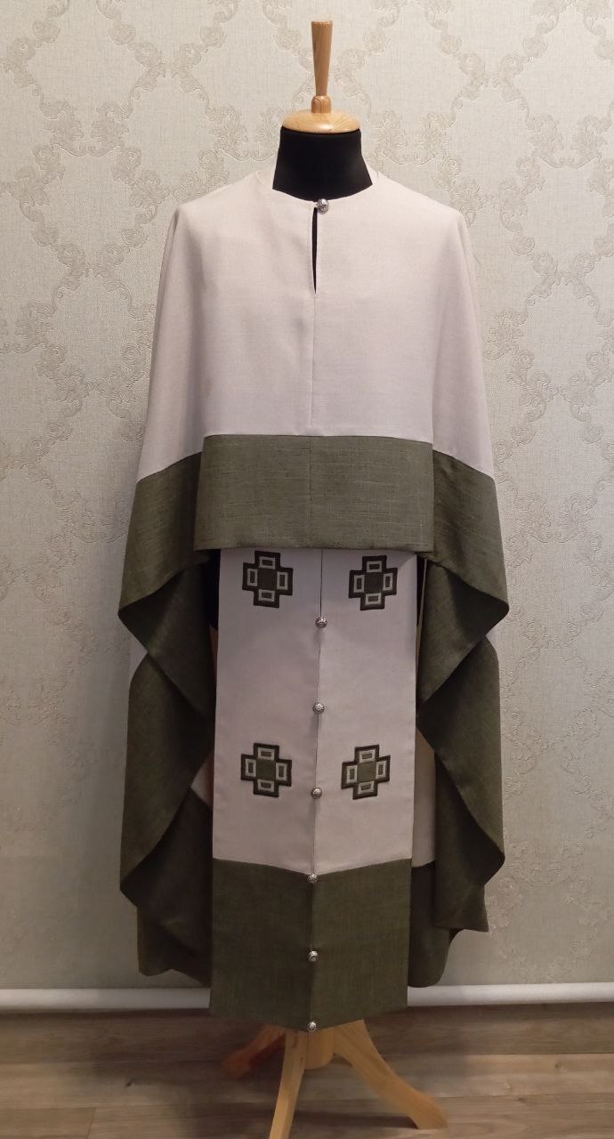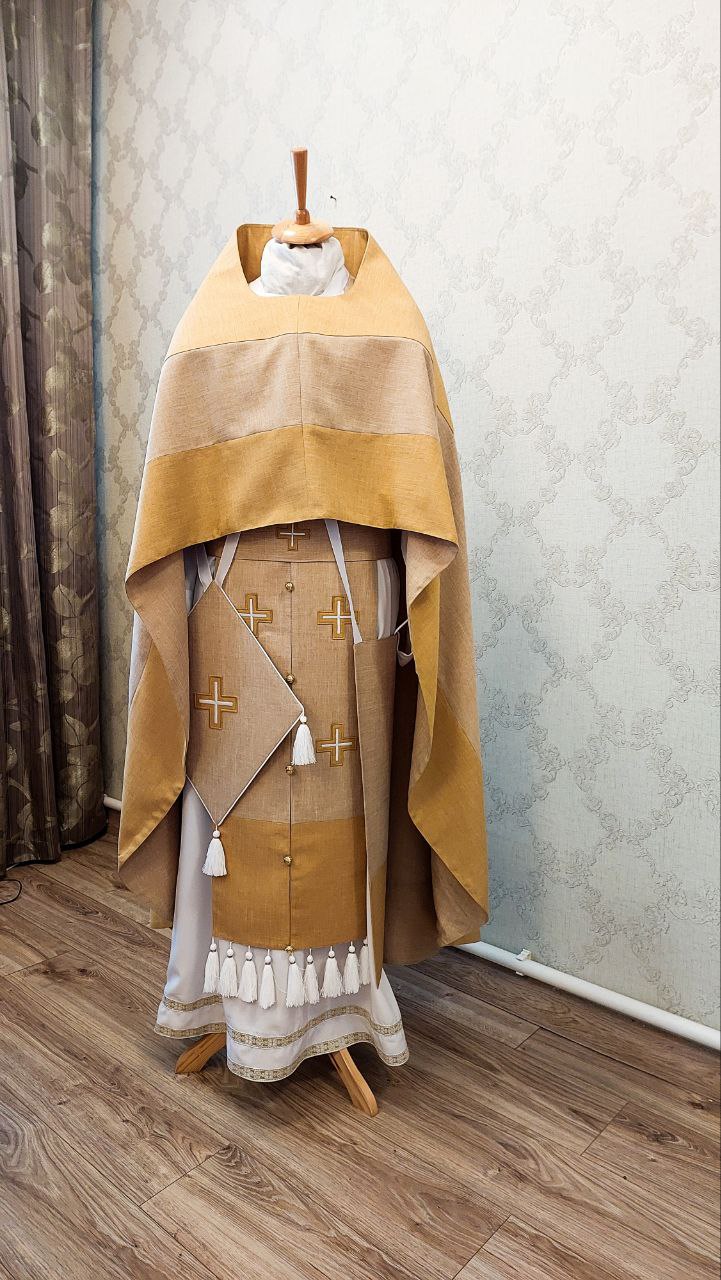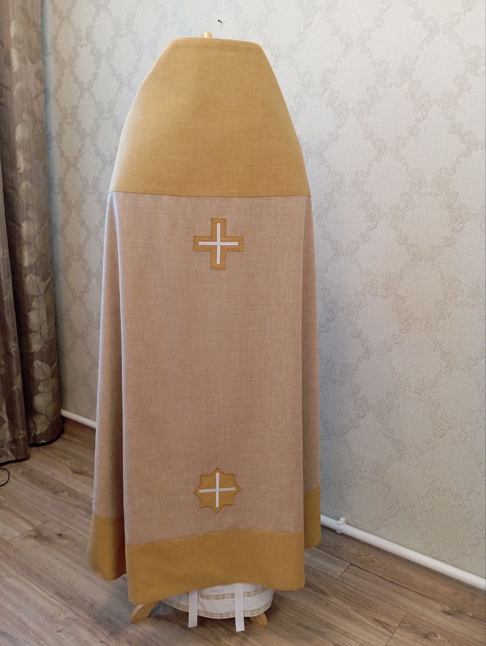Облачение сшито из искусственного льна (лавсановая нить). У ткани очень интересная неоднородная фактура натурального льна. Она невесома и прочна, но при этом совершенно не мнется. В облачении будет очень легко служить даже в самый жаркий день. Выбрать можно любой из 7 основных богослужебных цветов, вся фурнитура и вышивка будет подобрана. Возможен русский или греческий крой фелони.