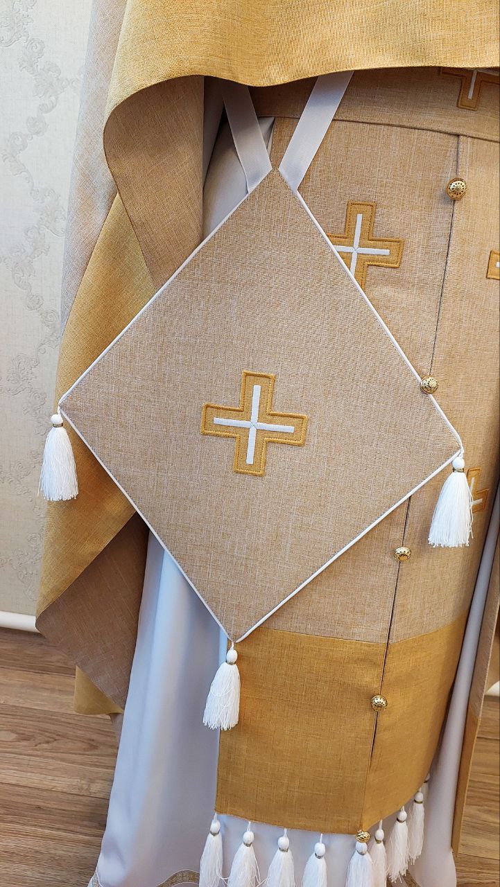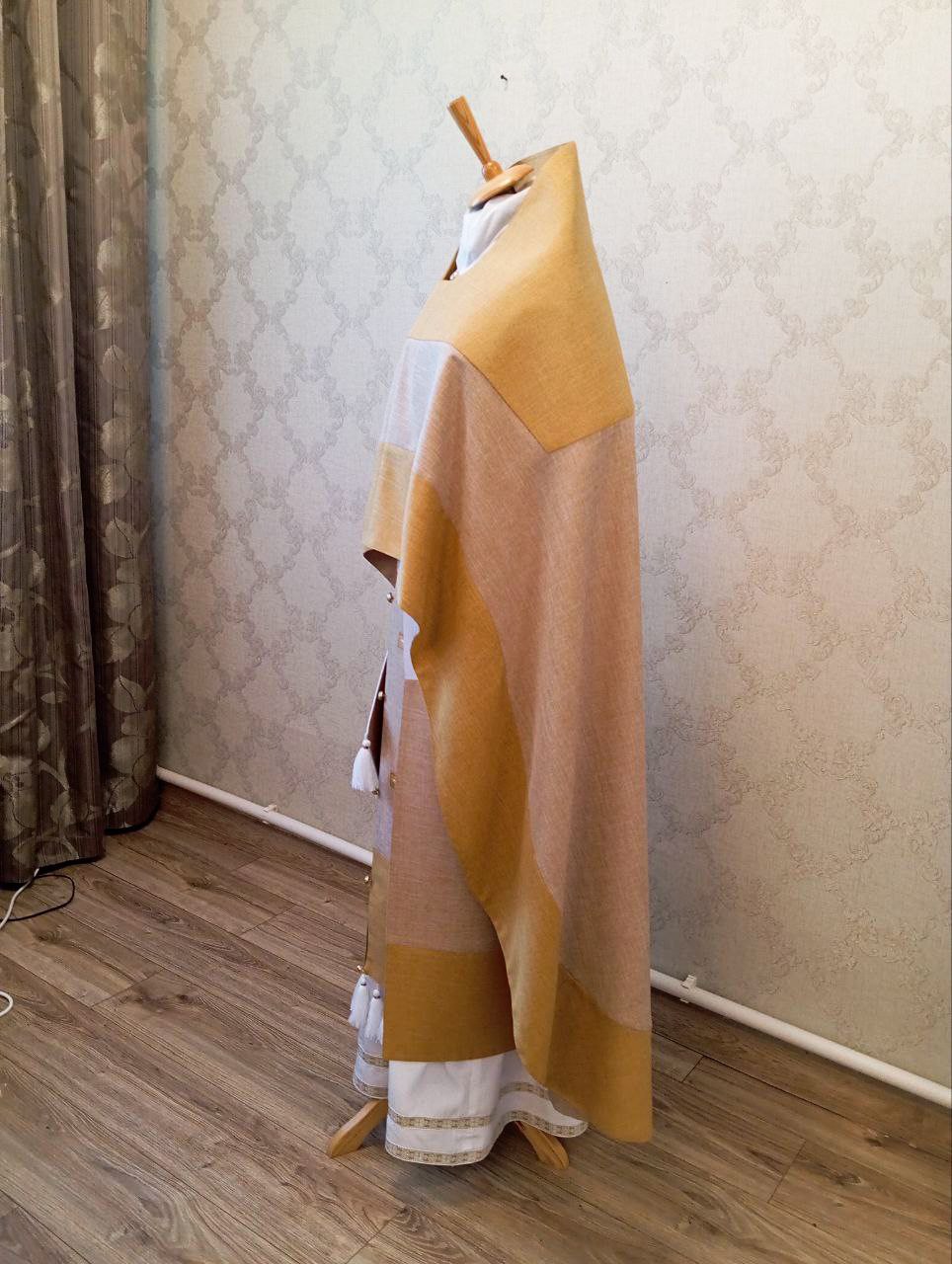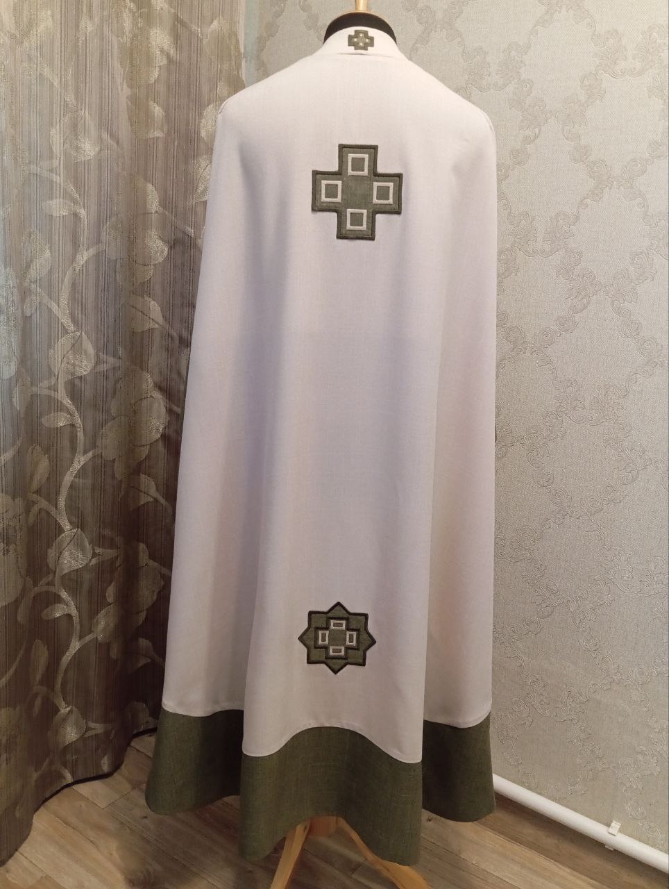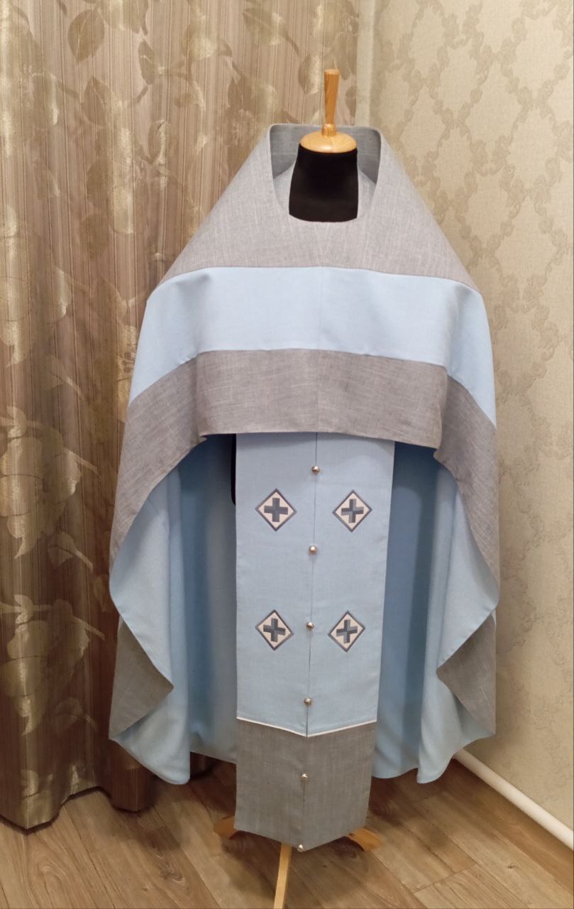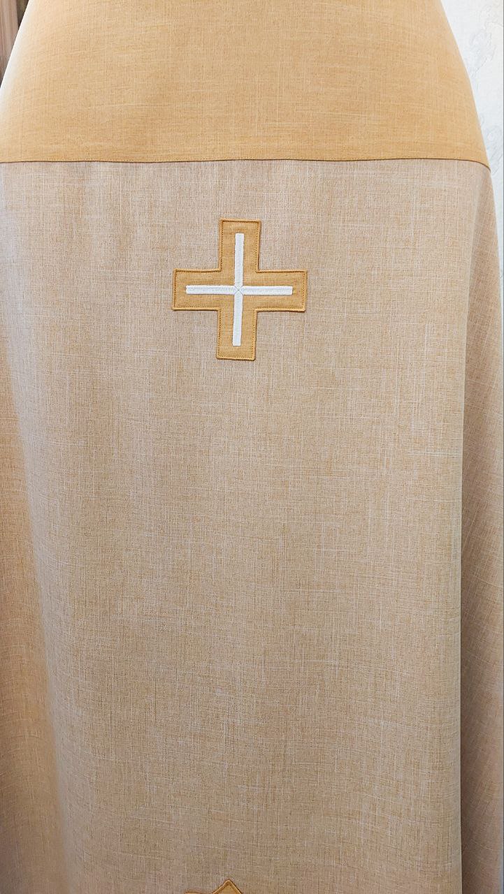 Облачение сшито из искусственного льна (лавсановая нить). У ткани очень интересная неоднородная фактура натурального льна. Она невесома и прочна, но при этом совершенно не мнется. В облачении будет очень легко служить даже в самый жаркий день. Выбрать можно любой из 7 основных богослужебных цветов, вся фурнитура и вышивка будет подобрана. Возможен русский или греческий крой фелони.