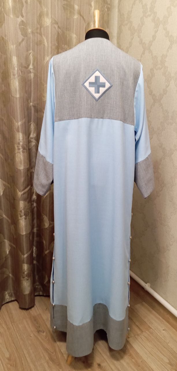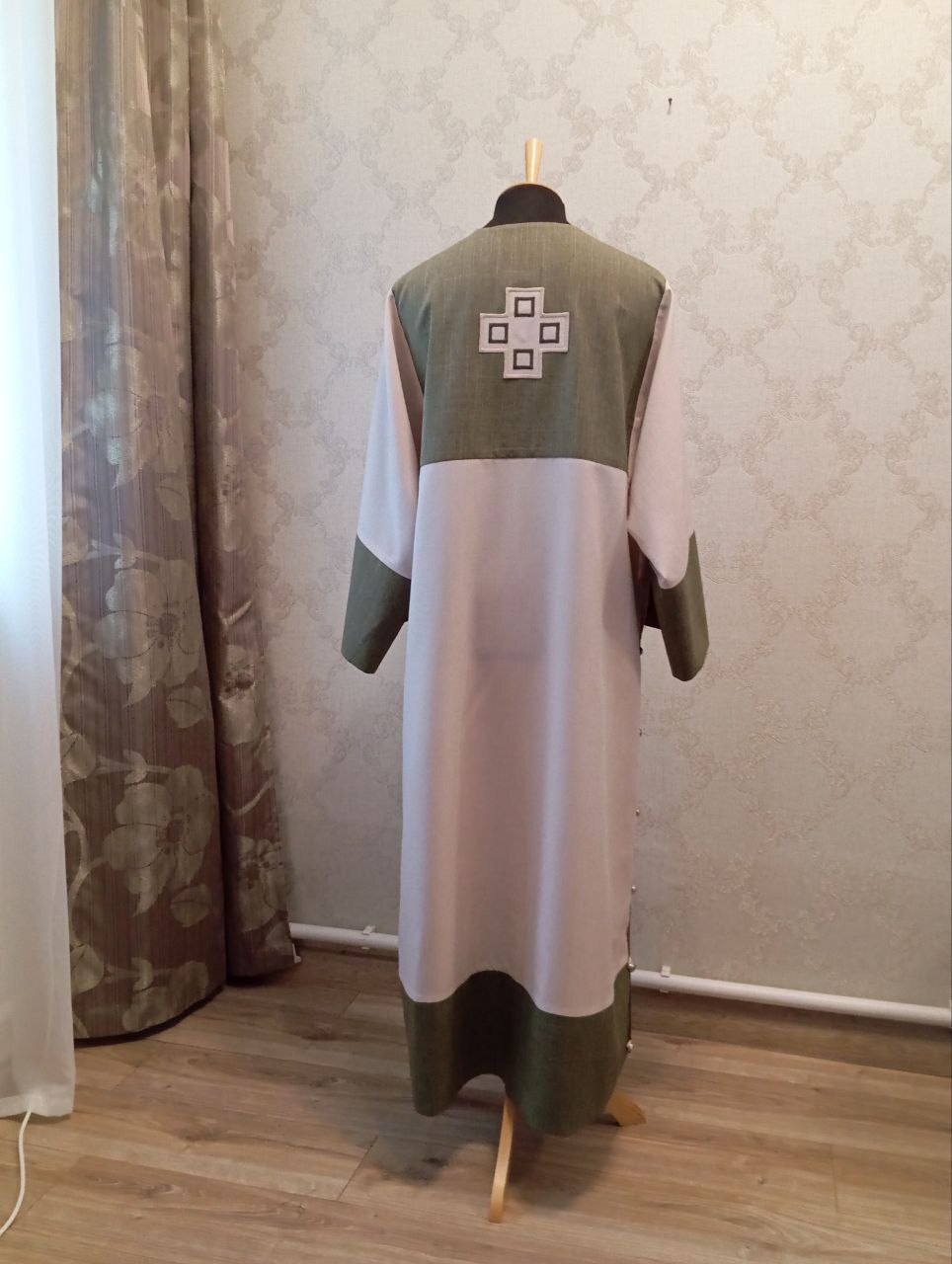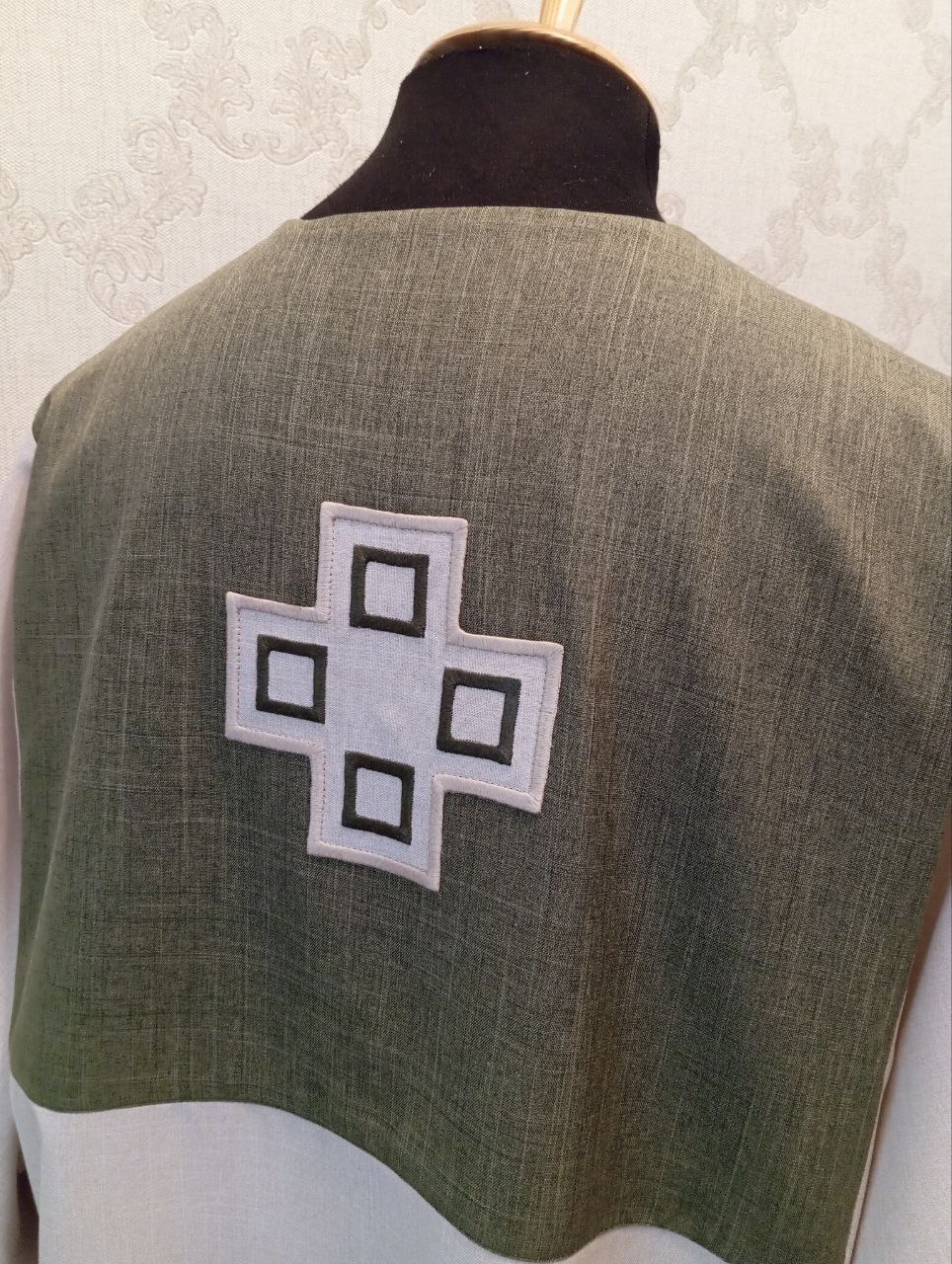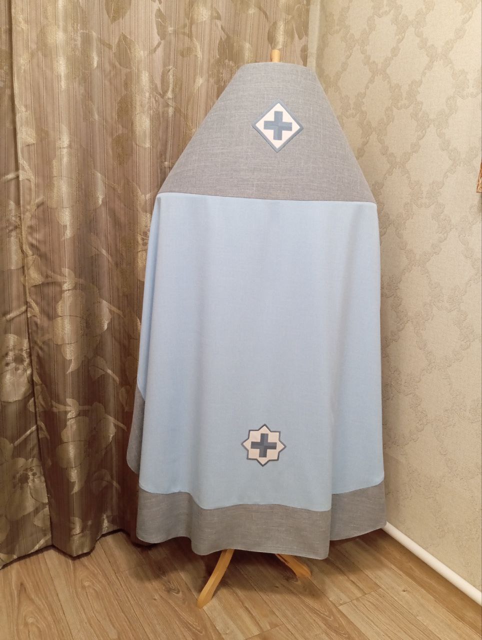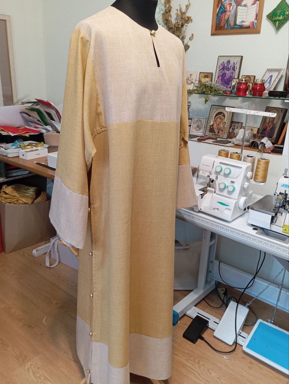 Облачение сшито из искусственного льна (лавсановая нить). У ткани очень интересная неоднородная фактура натурального льна. Она невесома и прочна, но при этом совершенно не мнется. В облачении будет очень легко служить даже в самый жаркий день. Выбрать можно любой из 7 основных богослужебных цветов, вся фурнитура и вышивка будет подобрана. Возможен русский или греческий крой фелони.